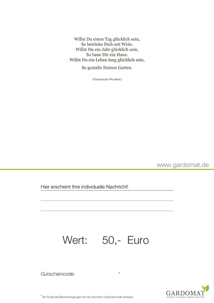 Sie können zwischen einem Wert von 50,- bis 1000,- € für die Gartenplanung online wählen. Es besteht die Möglichkeit eine individuelle Nachricht direkt auf den Gutschein drucken zu lassen. In der Gutscheinvorschau (Innenseite) erkennen Sie den Druckbereich an dem Satz: "Hier erscheint Ihre individuelle Nachricht!" Schreiben Sie dazu Ihren individuellen Text in das vorgesehene Feld. Die Länge ist auf 170 Zeichen beschränkt.